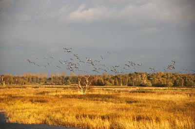 Erleben Sie mit uns den abendlichen Flug der Kraniche von den Futterplätzen zu ihren Übernachtungsplätzen in den grossen Flachwassergebieten der Boddenlandschaft.
